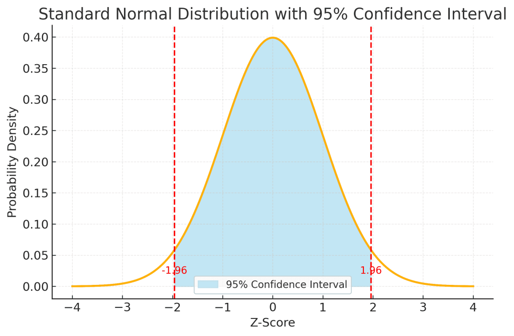 This diagram shows the standard normal distribution, the familiar bell-shaped curve, with the 95% confidence interval shaded in light blue.
